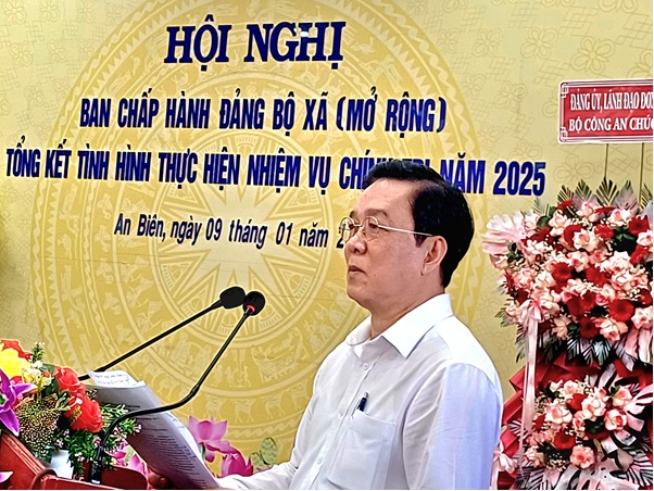 Phát biểu chỉ đạo hội nghị, đồng chí Phạm Hoàng Nam, Ủy viên Ban Thường vụ Tỉnh ủy, Trưởng Ban Tổ chức Tỉnh ủy ghi nhận và đánh giá cao những kết quả mà Đảng bộ, chính quyền và Nhân dân xã An Biên đạt được trong năm 2025, đặc biệt là trong thời gian đầu vận hành mô hình chính quyền địa phương hai cấp; đồng thời đề nghị địa phương tiếp tục nâng cao chất lượng công tác xây dựng Đảng, phát huy vai trò người đứng đầu, tập trung thực hiện thắng lợi các mục tiêu, nhiệm vụ năm 2026.