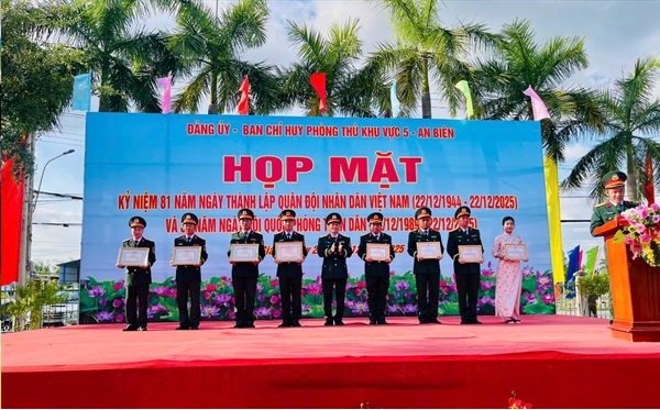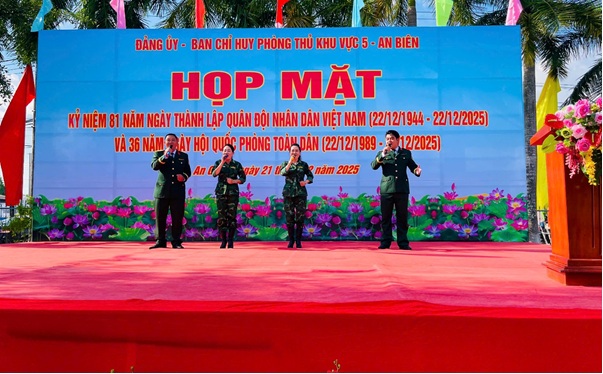 Chiều 21/12, Ban Chỉ huy Phòng thủ khu vực 5 – An Biên tổ chức họp mặt kỷ niệm 81 năm Ngày thành lập Quân đội nhân dân Việt Nam (22/12/1944 – 22/12/2025) và 36 năm Ngày Hội quốc phòng toàn dân (22/12/1989 – 22/12/2025). Dự buổi họp mặt có Đại tá Nguyễn Văn Ngành, Ủy viên Ban Thường vụ Tỉnh ủy, Chỉ huy trưởng Bộ Chỉ huy Quân sự tỉnh; Đại tá Vũ Thế Văn, Ủy viên Ban Chấp hành Đảng ủy Quân sự, Phó Chỉ huy trưởng Bộ Chỉ huy Quân sự tỉnh; Đại tá Phạm Anh Nguyên, Phó Bí thư Đảng ủy, Chỉ huy trưởng Ban Chỉ huy Phòng thủ khu vực 5 – An Biên; Thượng tá Huỳnh Thúc Đình, Bí thư Đảng ủy, Chính ủy Ban Chỉ huy Phòng thủ khu vực 5 – An Biên; cùng các đồng chí nguyên lãnh đạo Bộ Chỉ huy Quân sự tỉnh, huyện An Biên qua các thời kỳ; đại diện các xã trên địa bàn; các đồng chí sĩ quan, quân nhân chuyên nghiệp và thân nhân gia đình cán bộ, chiến sĩ Ban Chỉ huy Phòng thủ khu vực 5 – An Biên.