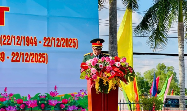 Thượng tá Huỳnh Thúc Đình, Bí thư Đảng ủy, Chính ủy Ban Chỉ huy Phòng thủ khu vực 5 – An Biên phát biểu ôn lại truyền thống