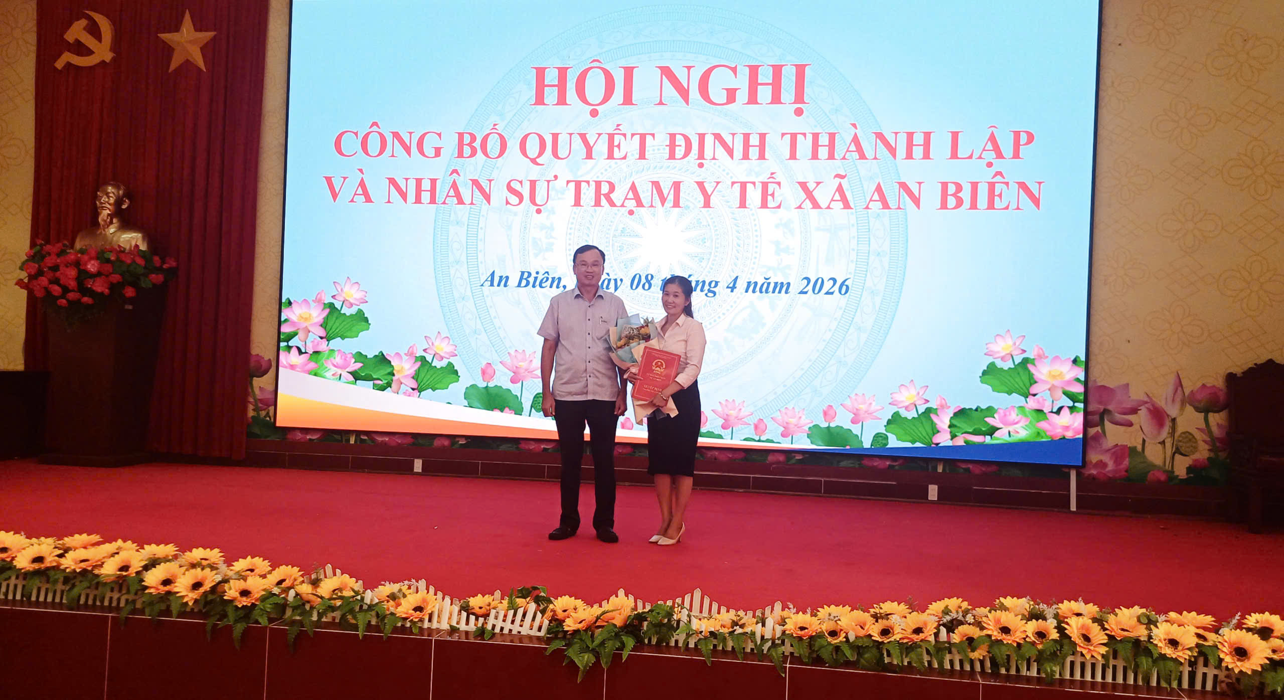 Tại hội nghị, đại diện UBND xã công bố Quyết định số 2119/QĐ-UBND về việc thành lập Trạm Y tế xã An Biên trên cơ sở tiếp nhận nguyên trạng các Trạm Y tế trên địa bàn; đồng thời công bố Quyết định số 1126/QĐ-UBND về công tác cán bộ. Theo đó, Trạm Y tế xã là đơn vị sự nghiệp công lập trực thuộc UBND xã, có tư cách pháp nhân, con dấu và tài khoản riêng, hoạt động theo quy định của pháp luật. Trên cơ sở các quyết định được ban hành, bà Tô Hoàng Yến được bổ nhiệm giữ chức Phó Giám đốc Trạm Y tế xã An Biên; đồng thời giao bà Tô Hoàng Yến phụ trách, điều hành toàn bộ hoạt động của Trạm cho đến khi kiện toàn chức danh Giám đốc theo quy định.