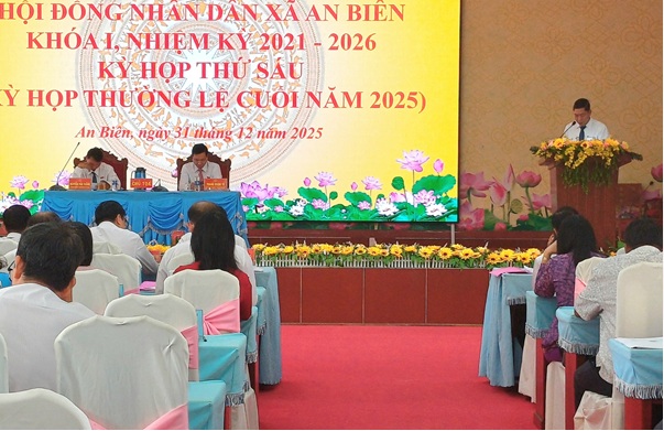 Sáng ngày 31/12, Hội đồng nhân dân xã An Biên khóa I, nhiệm kỳ 2021–2026 tổ chức kỳ họp thứ sáu (kỳ họp thường lệ cuối năm 2025). Kỳ họp do ông Trang Minh Tú – Phó Bí thư Thường trực Đảng ủy, Chủ tịch HĐND xã và ông Nguyễn Văn Thắng – Ủy viên Ban Thường vụ Đảng ủy, Phó Chủ tịch HĐND xã đồng chủ trì. Tham dự kỳ họp có ông Bùi Thanh Nhàn – Phó Trưởng Ban Văn hóa – Xã hội HĐND tỉnh An Giang; ông Trần Chiến Thắng – Bí thư Đảng ủy xã; ông Nguyễn Quốc Xinh – Phó Bí thư Đảng ủy, Chủ tịch UBND xã; đại diện Ủy ban MTTQ Việt Nam xã cùng các đại biểu HĐND xã khóa I và các cơ quan, đơn vị trực thuộc xã.