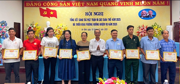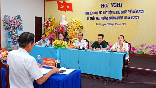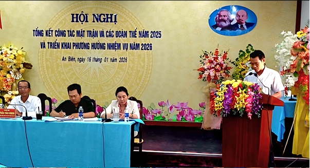 Chiều ngày 16/01, Ban Thường trực Ủy ban MTTQ Việt Nam xã An Biên tổ chức Hội nghị tổng kết công tác Mặt trận và các đoàn thể năm 2025, triển khai phương hướng, nhiệm vụ năm 2026. Đến dự có đồng chí Trần Chiến Thắng – Bí thư Đảng ủy xã; đồng chí Trang Minh Tú – Phó Bí thư Thường trực Đảng ủy, Chủ tịch HĐND xã cùng 140 đại biểu là bí thư chi bộ, trưởng ban công tác Mặt trận, cán bộ 4 hội đoàn thể của 24 ấp trên địa bàn. Hội nghị là dịp tổng kết chung hoạt động của hệ thống Mặt trận và các tổ chức chính trị – xã hội ở cơ sở, gồm: Ban Công tác Mặt trận, Hội Liên hiệp Phụ nữ, Hội Nông dân, Hội Cựu chiến binh và Đoàn Thanh niên tại 24 ấp sau khi thực hiện sắp xếp đơn vị hành chính.