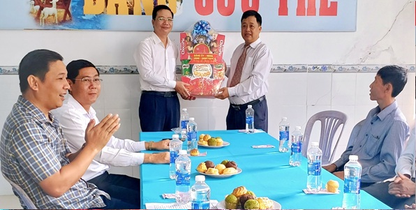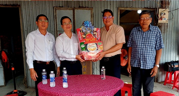 Đồng chí Phó Bí thư Thường trực Đảng ủy, Chủ tịch HĐND xã tặng quà chúc mừng Giáo họ Thứ Ba (ấp Đông Quý)