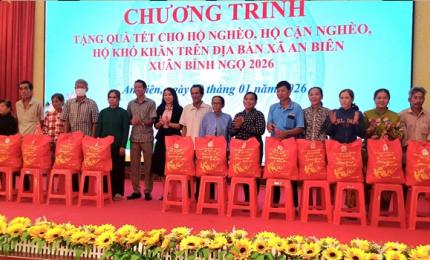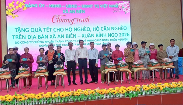 Ngày 10/02, Đảng ủy – HĐND – UBND – Ủy ban MTTQ Việt Nam xã An Biên phối hợp với Công ty Chứng khoán Thành Công (TP. Hồ Chí Minh) và đoàn thiện nguyện Nghĩa tình quê hương TP. Hồ Chí Minh tổ chức chương trình trao quà Tết cho hộ nghèo, hộ cận nghèo và hộ có hoàn cảnh khó khăn trên địa bàn xã, nhân dịp Xuân Bính Ngọ 2026.
